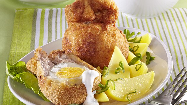 - Čtyři vejce uvaříme natvrdo a oloupeme. Sýr nastrouháme. Plátky masa posypeme sýrem a na něj položíme vařená vejce. Maso kolem náplně zabalíme do koule a upevníme párátkem nebo nití.