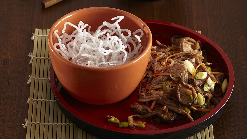 - Cibulku, mrkev a chilli papričku očistíme a nakrájíme na nudličky. Z nabobtnaných hub vymačkáme přebytečnou vodu a přidáme je společně s nakrájenou zeleninou k masu. Smícháme sójovou omáčku s rýžovým octem a podle chuti dresink osladíme. Hotovým dresinkem přelijeme maso se zeleninou a promícháme. Necháme chvilku rozležet.