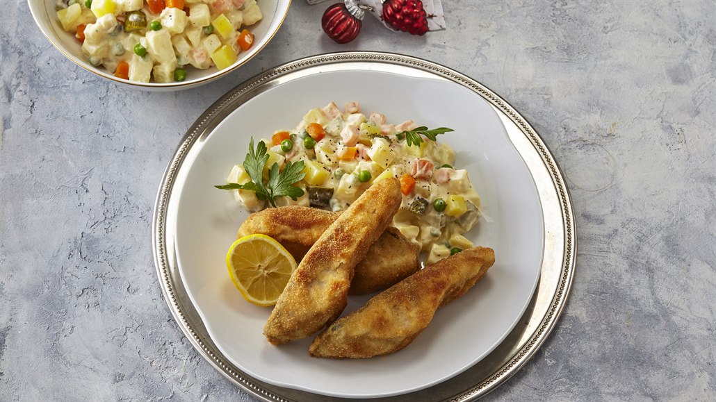 - Kapří filet naporcujeme na čtyři díly, osolíme ho, obalíme v trojobalu a pomalu smažíme ve větším množství oleje dozlatova. Hotového kapra podáváme s odleželým bramborovým salátem a citronem.