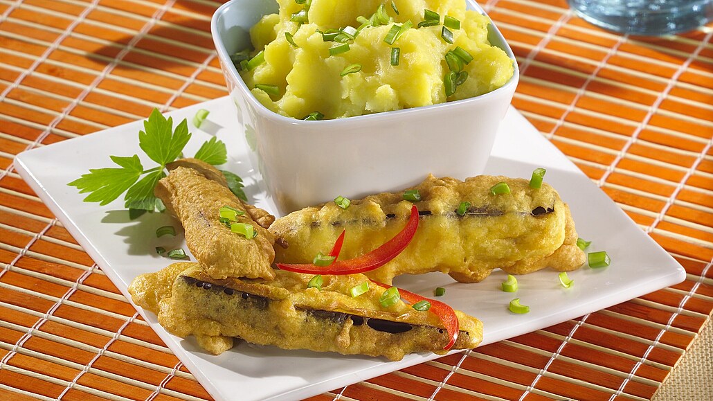- V pánvi rozpálíme olej a připravíme si talířek s papírovým ubrouskem. Plátky lilku opepříme a namáčíme do připraveného těstíčka. Ihned smažíme na rozpáleném oleji po obou stranách dozlatova. Papírovým ubrouskem vysušíme přebytečný olej. Vhodnou přílohou ke smaženým lilkům je bramborová kaše.