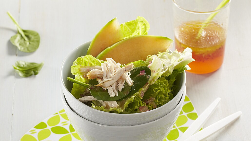- Med smícháme s najemno nakrájenou šalotkou, olivovým olejem, citronovou šťávou a dochutíme solí. Saláty natrháme a smícháme s melounem a kousky kuřecího masa. Směs rozdělíme do misek a zalijeme dresinkem.