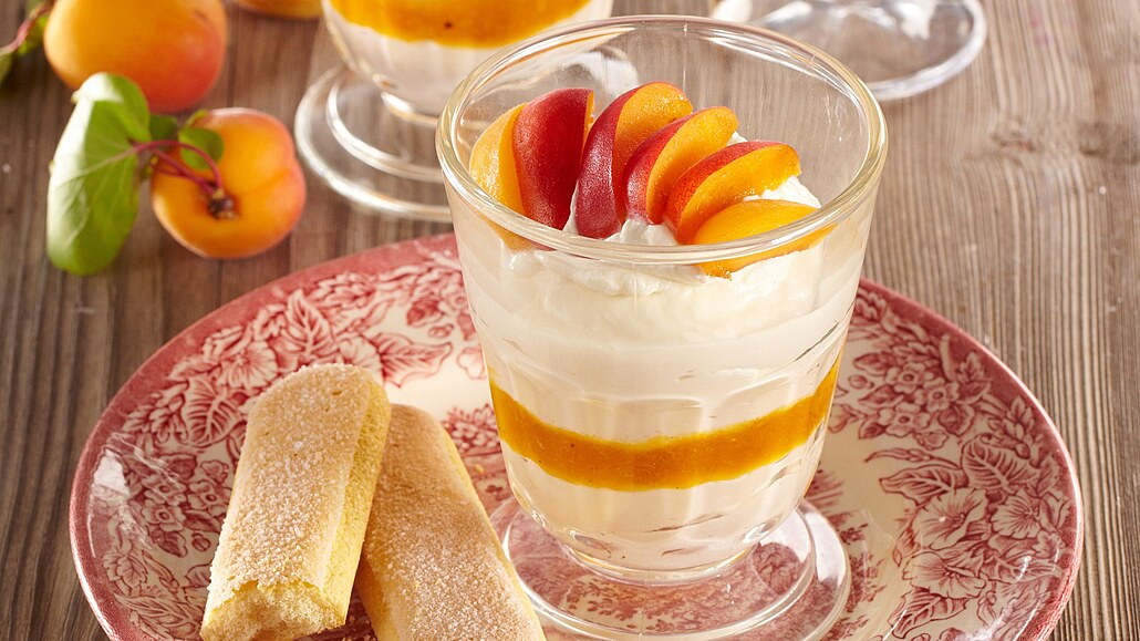 - Před podáváním nakrájíme zbylé meruňky na plátky a ozdobíme jimi jednotlivé porce. Servírujeme s cukrářskými piškoty.