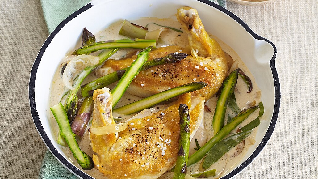 - Zalijeme vývarem, přidáme 2 snítky estragonu a pod pokličkou vše povaříme asi 10 minut. Mezitím si připravíme chřest. Odřízneme zdřevnatělé konce, podélně ho rozřízneme a vložíme k masu. Společně vaříme další 2 minuty.