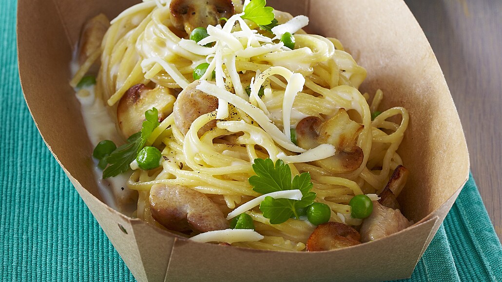 - V pánvi rozpálíme olej a osmažíme na něm šalotku. Přidáme nakrájené maso se žampiony a orestujeme. Zalijeme vývarem a krátce povaříme. Pak směs zjemníme smetanou a ochutíme solí a pepřem. Na konec do omáčky vmícháme rozmrazený hrášek a scezené těstoviny.