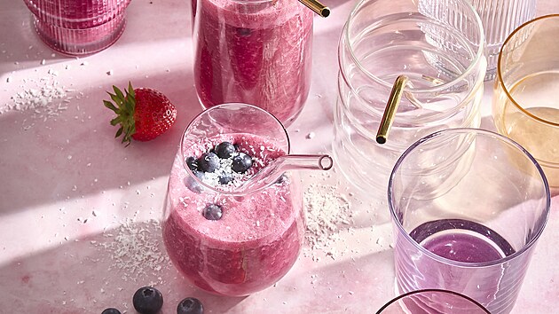 - Získanou šťávu spolu s mraženým banánem, mandlovým mlékem, kešu máslem a špetkou mleté vanilky rozmixujeme na smoothie. Nápoj z granátového jablka a červené řepy rozdělíme do sklenic a posypeme strouhaným kokosem a borůvkami. Sklenice můžeme dozdobit půlkami jahod.
