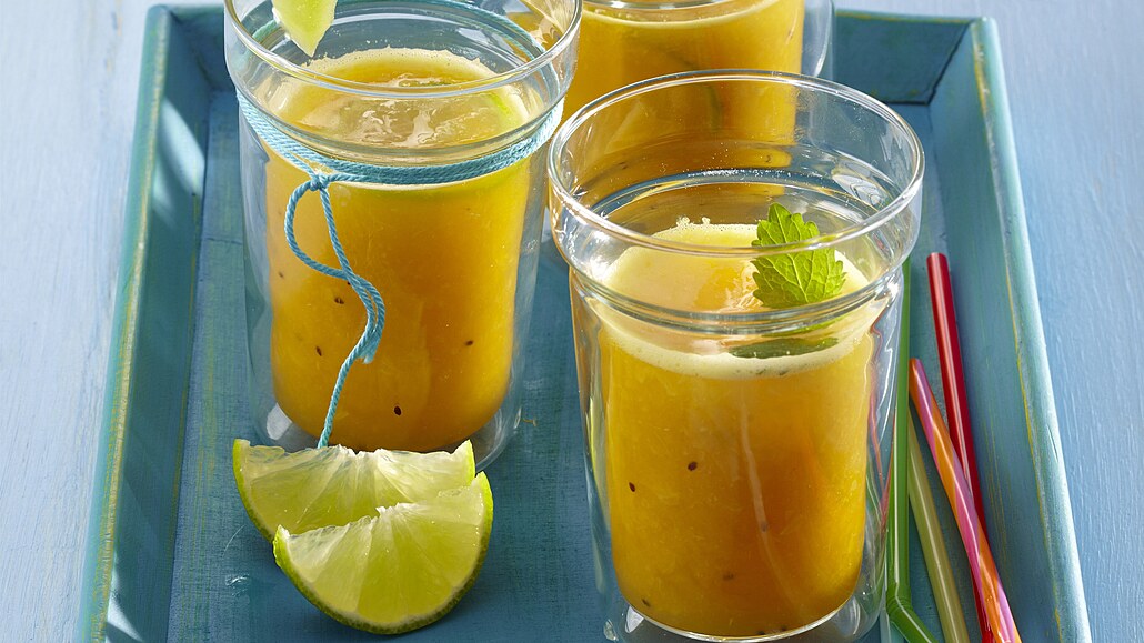 - Na dno sklenek dáme kostky ledu a zalijeme je připraveným nápojem. Ozdobíme plátkem kiwi nebo limetky a čerstvou meduňkou. Ihned podáváme.