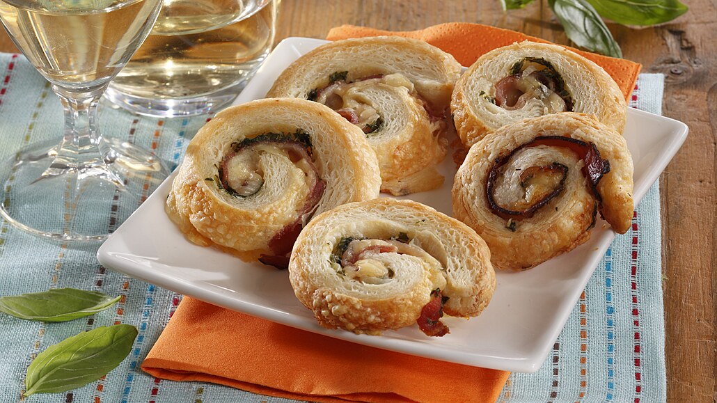 - Těsto rozdělíme na tři díly, které rozválíme na pláty velké asi 15x20 cm. Každý lehce potřeme osoleným, rozšlehaným vejcem, posypeme bazalkou a podélně poklademe dvěma plátky šunky i sýra.