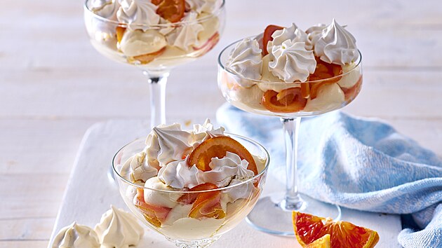 - Vlijeme rozmíchaný pudinkový prášek s mlékem a povaříme za stálého míchání 2 minuty. Po uvaření necháme vychladnout. Smetanu vyšleháme dotuha a vychladlý pudink do ní lehce vmícháme. Do pohárků střídavě plníme krém, pomeranče a pusinky.