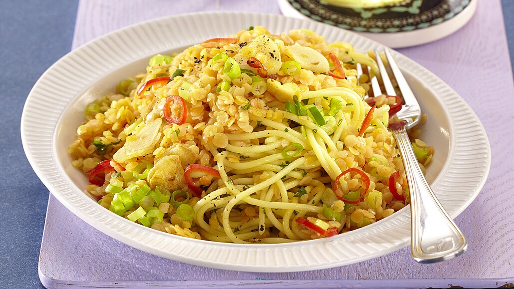 - Špagety uvaříme dle návodu na obalu na skus. Scedíme je, rozdělíme na talíře a doplníme čočkou.