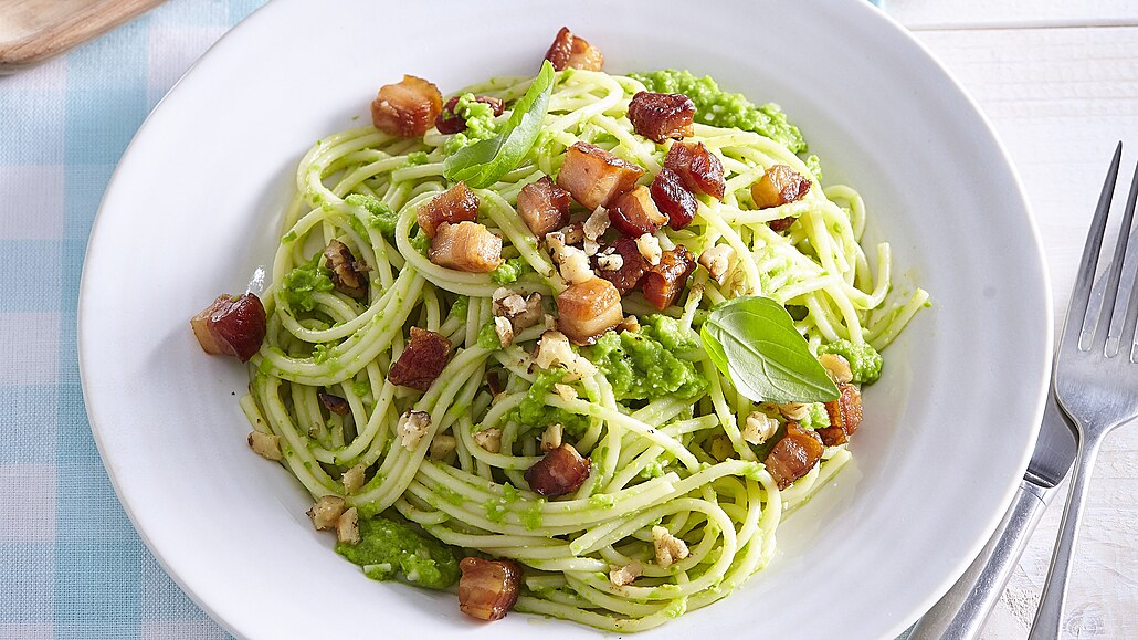 - Uvařené těstoviny scedíme, dáme do mísy, přidáme k nim hráškové pesto, promícháme a rozdělíme na talíře. Pokrm posypeme slaninou a rozdrcenými upraženými ořechy. Nakonec dozdobíme lístky bazalky.