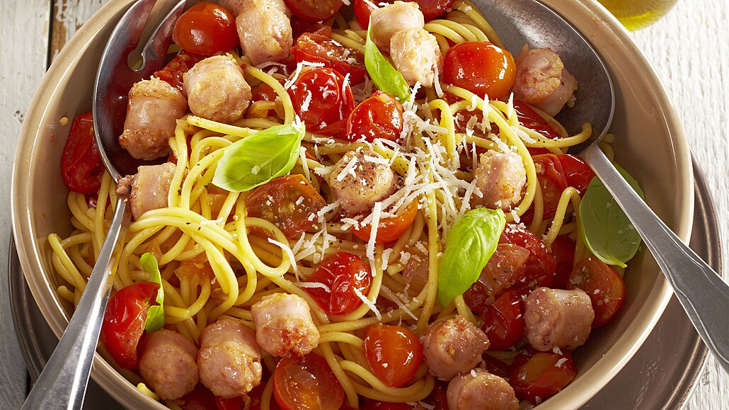 - Cherry rajčátka opláchneme a překrojíme napůl. Přidáme je do pánve a necháme mírně změknout. Pak vmícháme těstoviny a bazalku. Vše podlijeme troškou vody z těstovin, podle chuti osolíme a opepříme a společně vše ještě chvíli prohřejeme. Parmazán nastrouháme a jednotlivé porce jím posypeme.