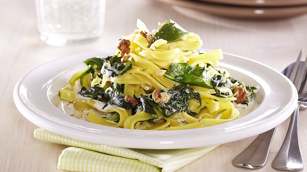 - Špenát opláchneme a necháme okapat. Těstoviny uvaříme ve vroucí osolené vodě al dente. Scedíme je a necháme okapat.