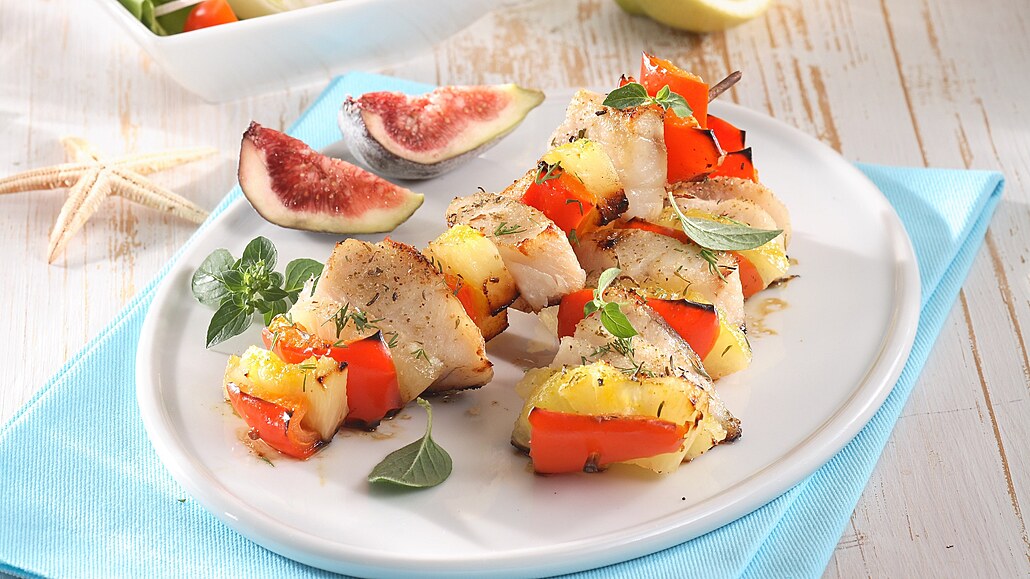 - Na špejle střídavě napichujeme marinované kousky ryby, ananasu a papriky. Grilujeme je na rozpáleném roštu ze všech stran asi 5 minut. Během grilování potíráme zbylou marinádou.