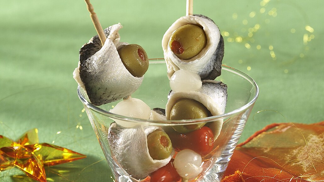 - Kyselé rybí filety nakrájíme na proužky, poklademe olivami a stočíme. Cibulky a papričky přecedíme přes síto a necháme okapat.