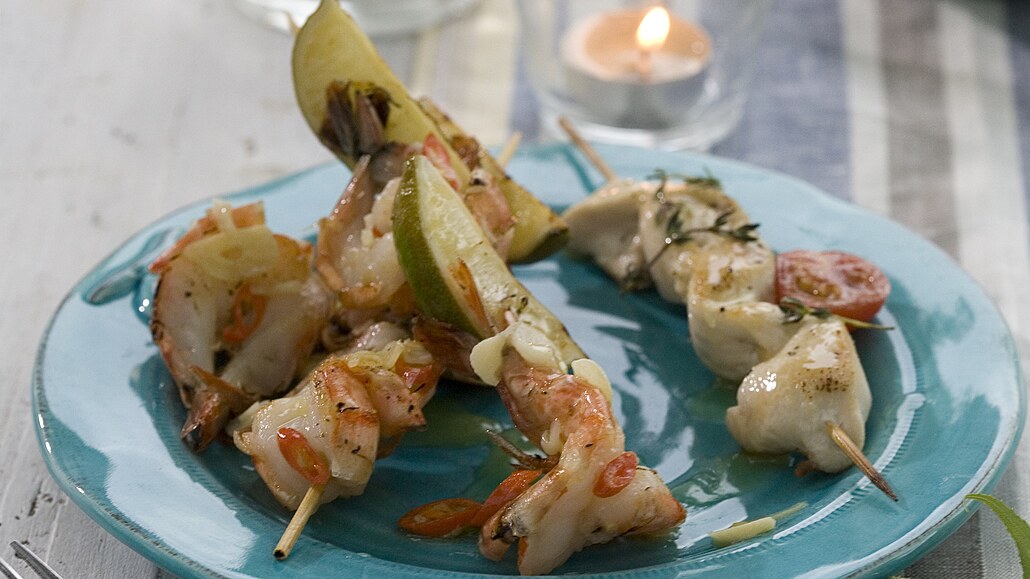 - Z kuřecích prsou nakrájíme delší nudličky, široké asi 1cm. Osolíme je, opepříme, pokapeme olivovým olejem a šťávou z limetky. Stejným způsobem naložíme i krevety. Každé zvlášť necháme alespoň 2 hodiny marinovat. Pak na špízy napícháme zvlášť kuřecí maso a zvlášť krevety a za občasného otáčení grilujeme. Krevety grilujeme asi 10 minut, kuřecí maso asi 15 minut.