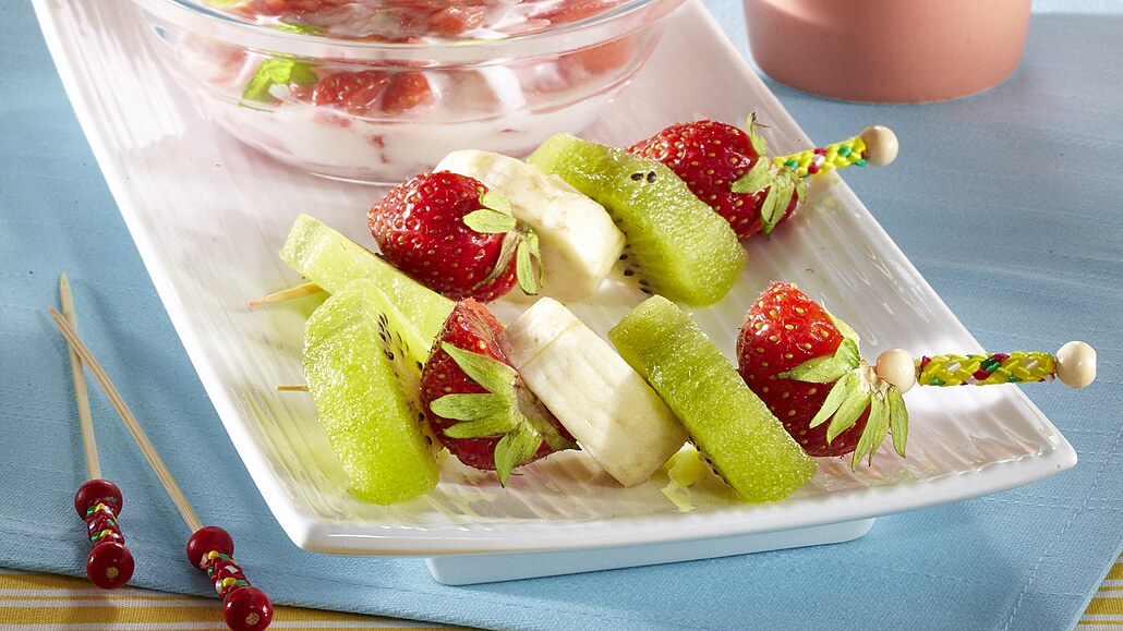 - Kiwi a banán oloupeme a nakrájíme na plátky. Zbylé jahody přepůlíme. Všechno ovoce střídavě napichujeme na špízy.