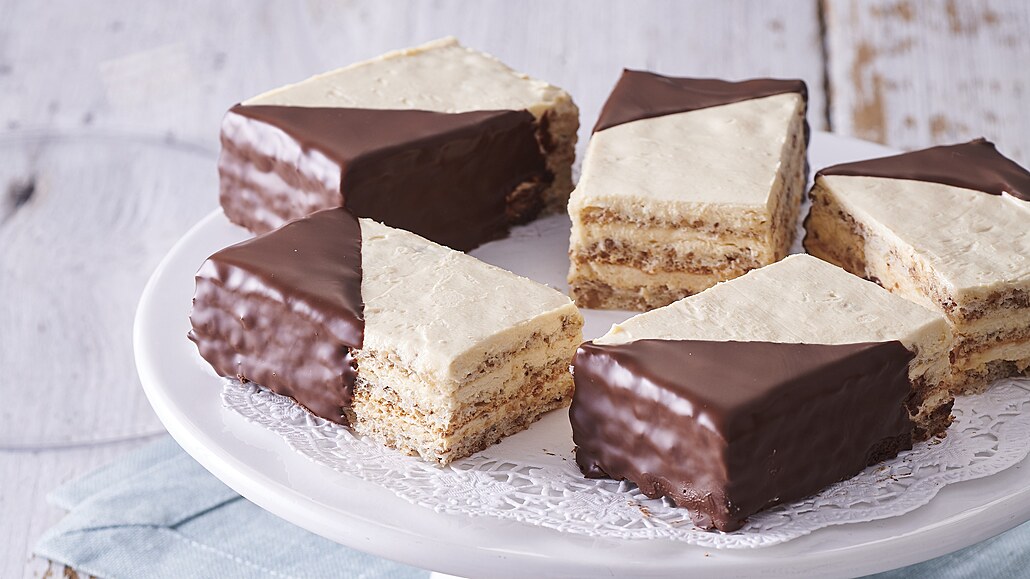 - Ztuhlý řez rozkrájíme na porce cca 5 x 7 cm. Čokoládu rozpustíme na horké vodní lázni a štafetky do ní šikmo z poloviny namočíme. Necháme je okapat na mřížce, přendáme na tác s pečicím papírem a necháme zatuhnout v chladničce.