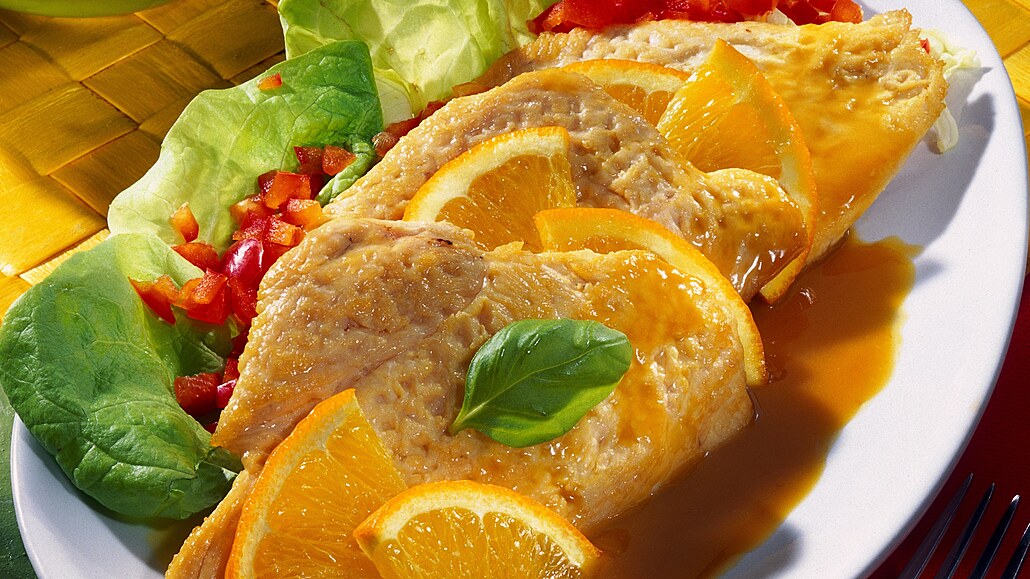 - Na pánvi rozehřejeme olej a prsa po obou stranách opečeme. Pak je vyjmeme a uchováme na teplém místě. Výpek zalijeme zbylou marinádou a krátce povaříme. Přilijeme ve vodě rozmíchaný solamyl a šťávu z druhého pomeranče. Šťávu provaříme zjemníme máslem.
