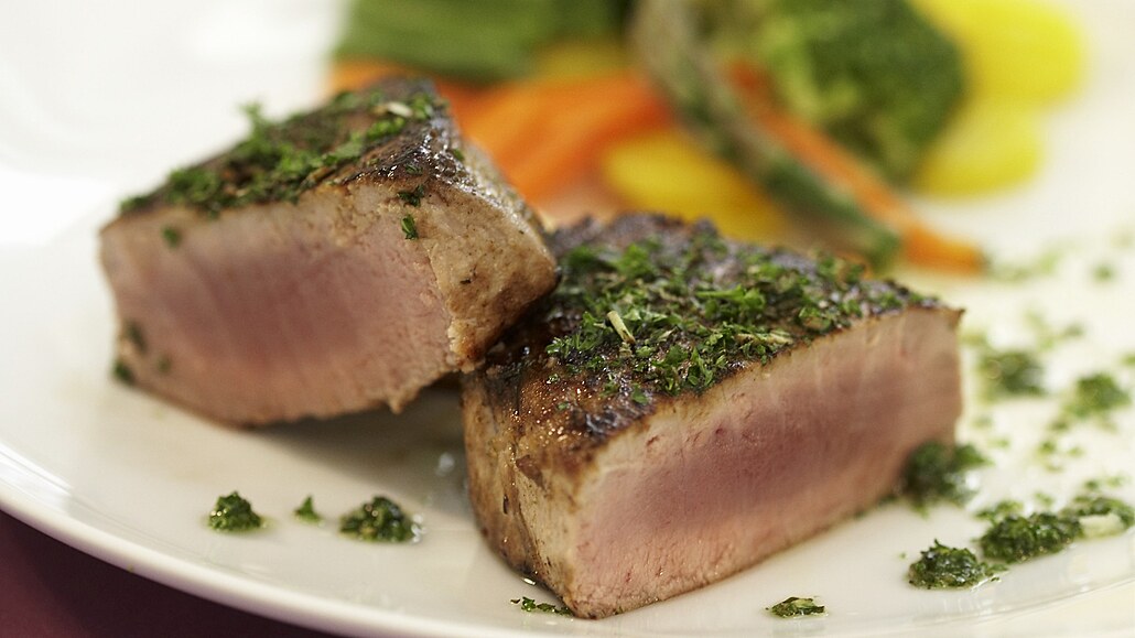 - Pak zprudka a hlavně krátce steaky opečeme na rozpáleném olivovém oleji. Steaky vyndáme z pánve, necháme chvíli na talíři dojít a před podáváním je obalíme v jemně posekaných bylinkách. Podáváme se zeleným pestem.
