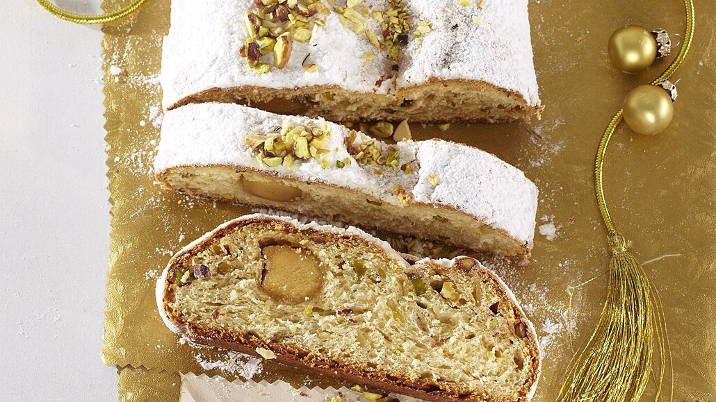 - Štolu přeneseme na plech vyložený pečicím papírem a dalších 20 minut necháme kynout. Poté ji vložíme do trouby předehřáté na 180 °C a necháme péct. Po 15 minutách teplotu snížíme na 160 °C. Štolu dopékáme 40 minut. Upečenou štolu přemístíme na kovou mřížku. Ihned ji potřeme máslem a silně pocukrujeme. Po vychladnutí ji rozdělíme na plátky.