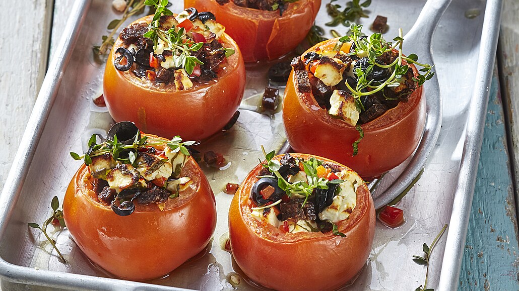 - Z rajčat odřízneme vršek, vydlabeme z nich dužinu a nakrájíme ji. Česnek nasekáme najemno, cibulku na kolečka, olivy najemno a tymián otrháme. Chléb a fetu nadrobíme.