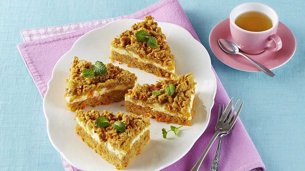 - Suroviny na náplň krátce vyšleháme a vlijeme na těsto ve formě. Zbylé těsto nastrouháme na povrch moučníku. Pečeme ve vyhřáté troubě při 160 °C asi 50 minut. Necháme vychladnout a rozkrájíme na jednotlivé řezy, které můžeme dozdobit marcipánovými mrkvičkami nebo mátou.