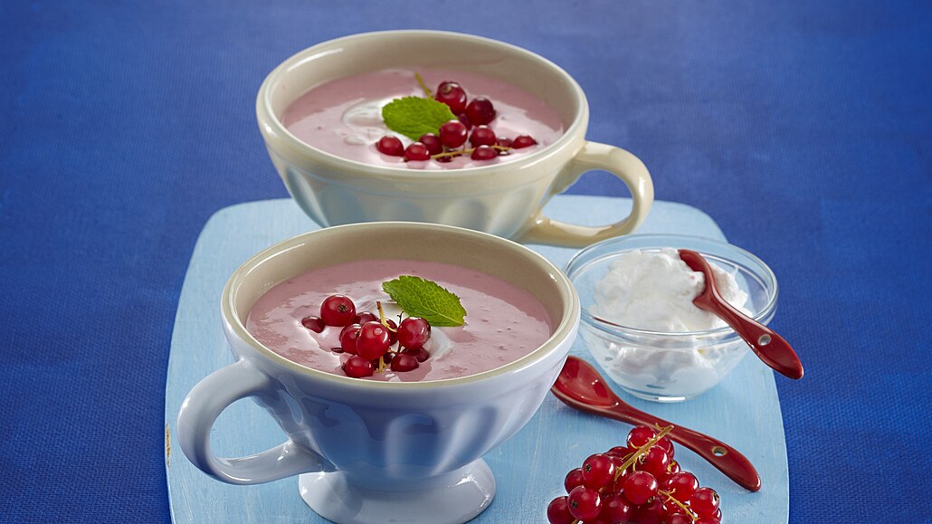 - Hotovou polévku zjemníme smetanou a uložíme ji asi na hodinu do chladničky. Vychlazenou polévku rozdělíme do misek, doplníme zakysanou smetanou a podáváme ozdobenou rybízem a mátou.
