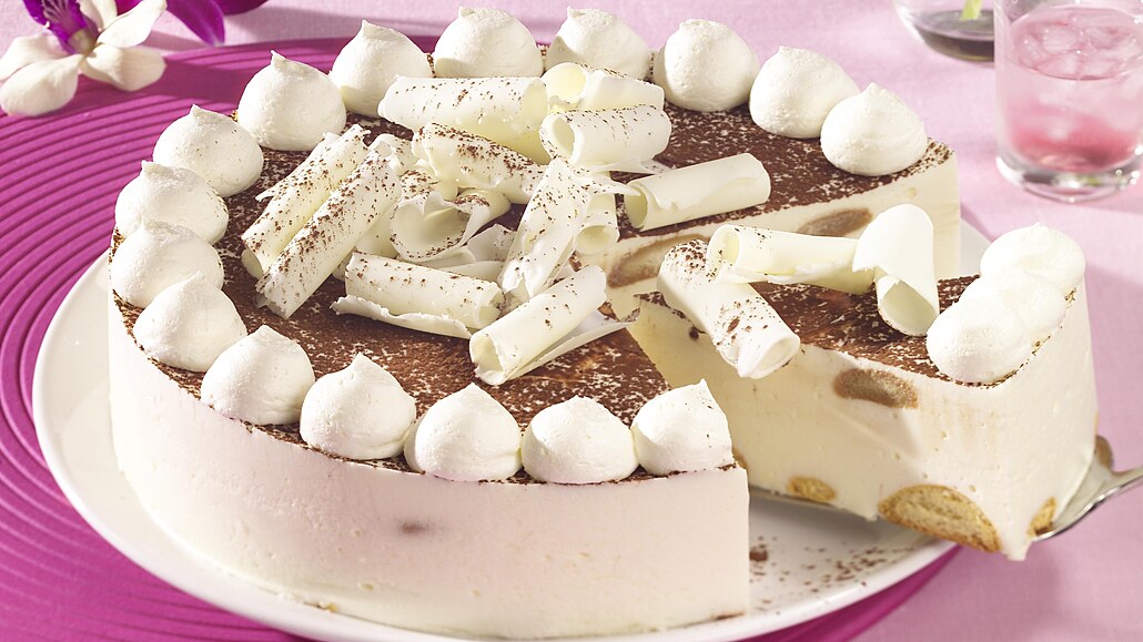 - Na krém pokládáme mírně navlhčené piškoty v kávovém odvaru a vrstvení opakujeme, až je forma plná (poslední vrstvu tvoří krém). Dort dáme do chladničky ztuhnout a pak vyklopíme. Povrch posypeme kakaem a ozdobíme zbylou šlehačkou a čokoládovými hoblinkami.