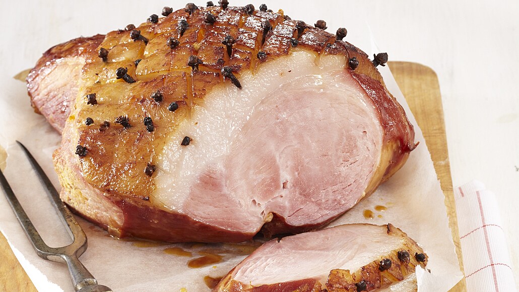 - Kůži na šunce trochu odřízneme a pak prsty opatrně celou oddělíme od masa. Tuk na povrchu nakrájíme ostrým nožem do kosočtverečkové mřížky. Do průsečíků zapíchneme střídavě hřebíček a kuličky celého pepře. Pokud má šunka kost, obalíme ji před pečením alobalem.