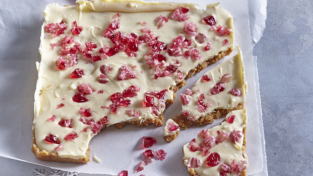 - Bonbony rozdrtíme paličkou na větší kousky. Čokoládu nasekáme na kousky. Vsypeme ji do misky a rozpustíme na vodní lázni. Rozpuštěnou čokoládu nalijeme na vychlazený tuhý sušenkový korpus a necháme ji asi 5 minut mírně zatuhnout. Pak čokoládový povrch posypeme rozdrcenými bonbony. Vrátíme do lednice a necháme znovu asi 2 hodiny zatuhnout. Po zatuhnutí korpus rozkrájíme nebo nalámeme na kousky.