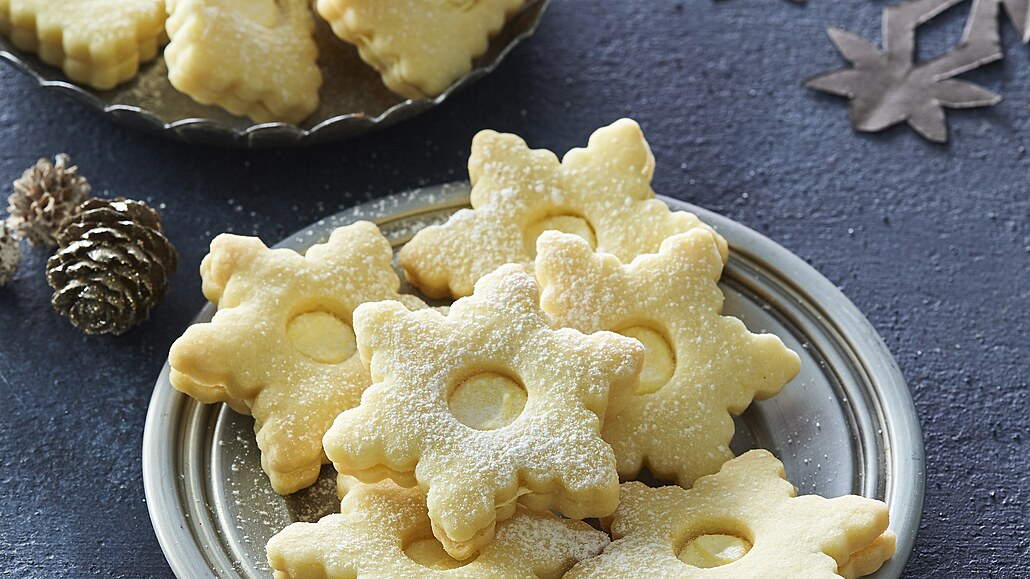 - Na pomoučněném vále těsto vyválíme na plát silný asi 3 mm a formičkou vykrájíme vybrané tvary. Na polovině vykrojených kousků vykrojíme středy pomocí malého kulatého vykrajovátka. Vše přendáme na plech vyložený pečicím papírem a pečeme v troubě předehřáté na 180 °C asi 8-10 minut dorůžova.