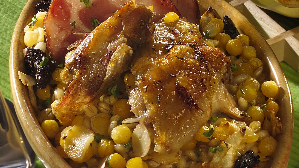 - Kachnu vyjmeme z pekáčku a na výpeku orestujeme najemno nakrájenou cibuli, přidáme hrách a krupky, utřený česnek a vše promícháme, osolíme a opepříme.