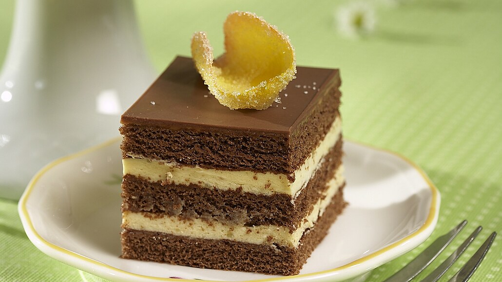 - Pekáček s vyšším okrajem o velikosti 30 x 40 cm vymažeme tukem a vysypeme moukou. Naplníme ho těstem a pečeme v předehřáté troubě při 170 °C asi 45 minut. Po upečení necháme v pekáčku 10 minut zchladnout, pak okraj uvolníme nožem a korpus vyklopíme na kovovou mřížku. Necháme vychladnout a pak vodorovně rozřízneme na tři díly.