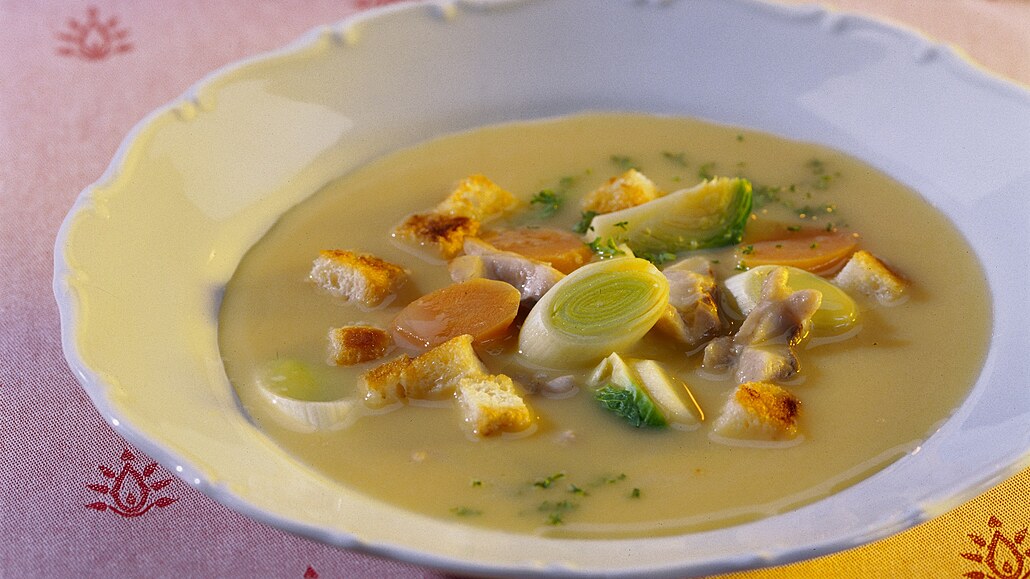 - Nakonec polévku ochutíme vínem, muškátovým květem a smetanou, přidáme jikry a krátce povaříme. Jednotlivé porce posypeme petrželkou a kostičkami bílého pečiva osmaženého na lžící oleje.