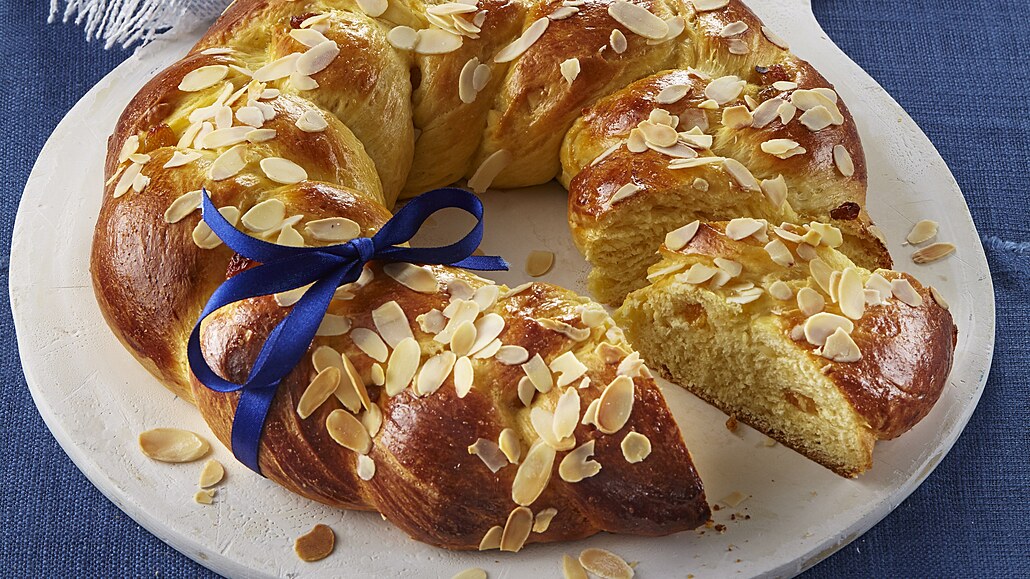 - Po vykynutí potřeme povrch rozšlehaným vejcem, posypeme mandlemi a pečeme v předehřáté troubě při 200 °C asi 10 minut. Pak teplotu snížíme na 170 °C a dopékáme dalších 20 minut. Po upečení necháme věnec vychladnout na kovové mřížce.