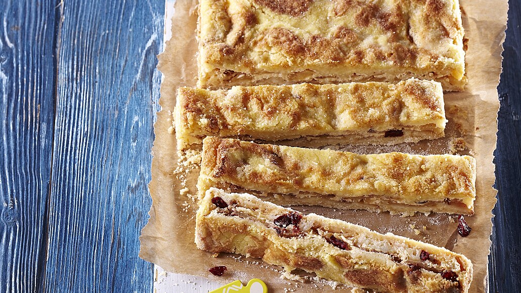 - Jablka rozložíme na moučnou směs na plechu, posypeme je brusinkami, skořicí a zalijeme tvarohovou hmotou. Na ni nasypeme zbylou moučnou směs a poklademe ji tenkými plátky másla. Pečeme ve vyhřáté troubě při 180 °C asi 45 minut dozlatova. Můžeme podávat ještě lehce vlažné.