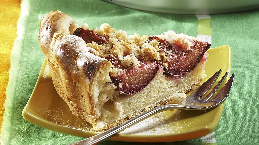 - Z těsta vyválíme kulatou placku a vyložíme jí tukem vymazanou formu. Na těsto rozložíme půlky švestek a posypeme drobenkou, kterou vypracujeme z mouky, cukru, másla, kypřícího prášku do pečiva a žloutku. Koláč pečeme při 180 °C asi 20 minut, až okraje zezlátnou.