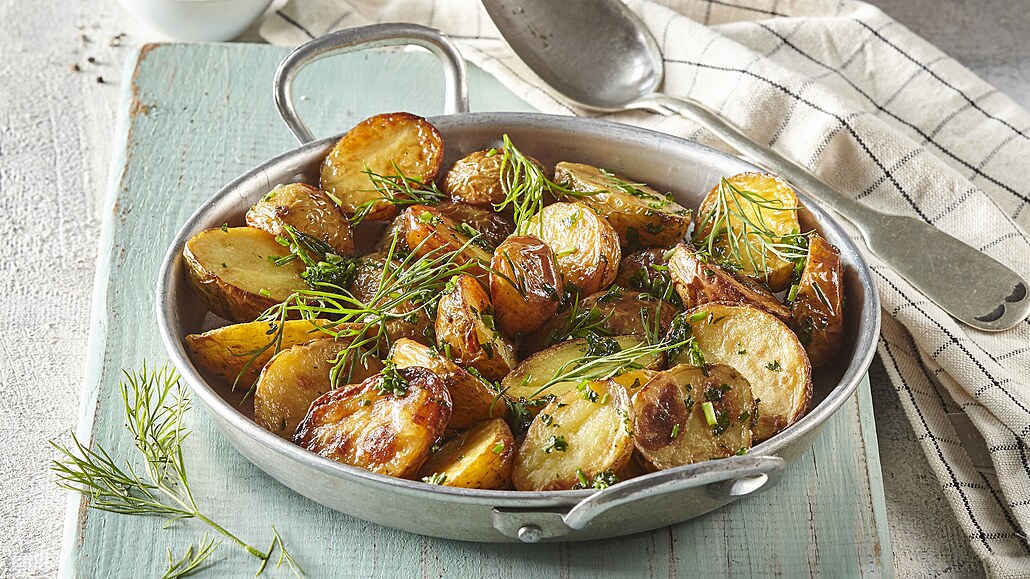 - V misce smícháme nakrájené bylinky s olejem. V této směsi povařené brambory obalíme a poté je nasypeme do malého pekáčku. Zakryjeme alobalem, vložíme do trouby předehřáté na 200 °C a brambory pečeme 15 minut. Pak je odkryjeme a dopečeme dozlatova.