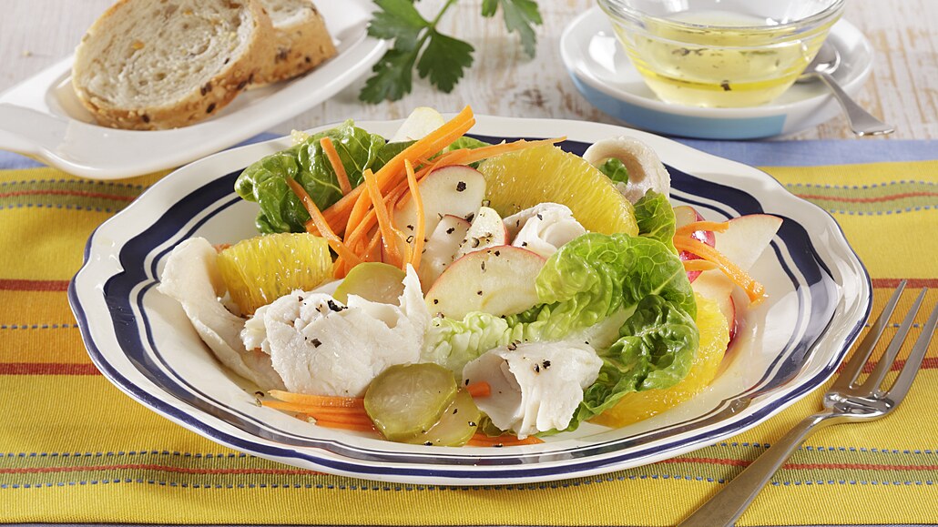 - V misce smícháme olej s octem, cukrem, solí, pepřem a 3 lžícemi vody. Nakrájenou zeleninu s ovocem rozdělíme na talíře, doplníme kousky ryby a přelijeme dresinkem.