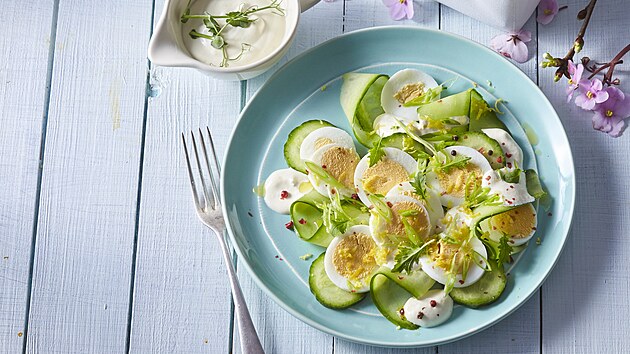 - Vejce uvaříme natvrdo, necháme vychladnout a oloupeme. Okurku a cibulku omyjeme, nakrájíme na tenké plátky a kolečka, okurku naservírujeme na talíř. Vejce nakrájíme na tenké plátky a rozložíme na okurku, posypeme cibulkou.