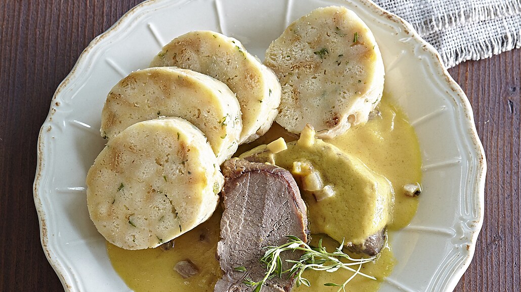 - Maso nakrájíme na plátky, přelijeme omáčkou a podáváme s houskovými knedlíky, ozdobené větvičkami tymiánu a brusinkami.