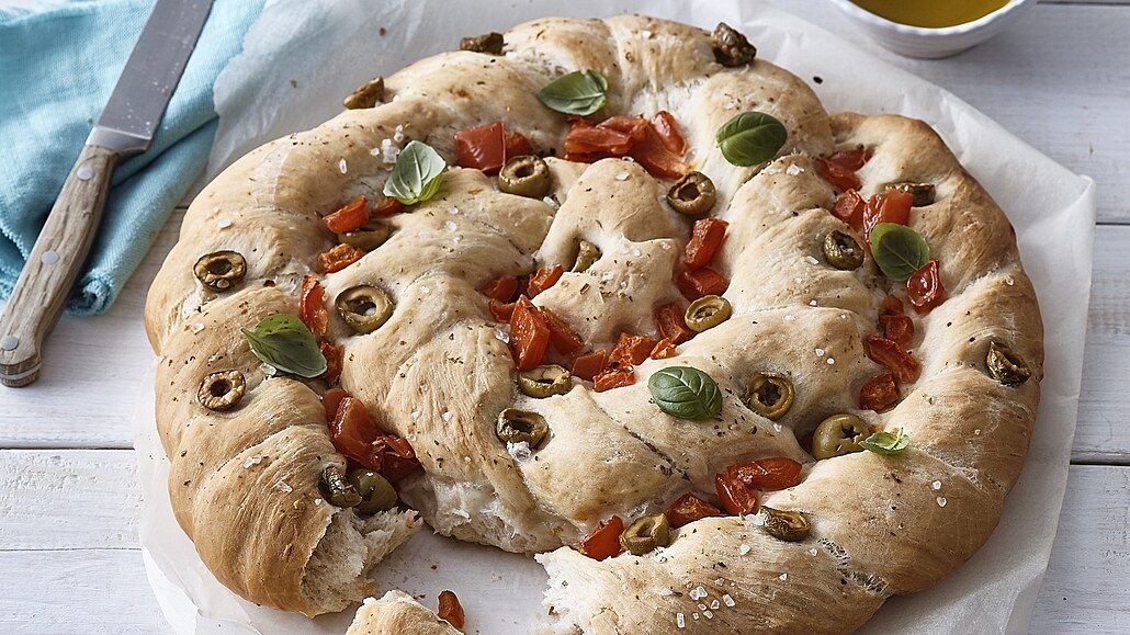 - Olivy rozkrájíme na poloviny. Rajčata omyjeme, odstraníme semeníky a dužinu nakrájíme na malé kousky. Focacciu posypeme oreganem a hrubou solí. Ve spojích ji poklademe připravenými rajčaty a olivami. Pečeme v troubě předehřáté na 200 °C asi 15 minut dozlatova. Po upečení necháme vychladnout na mřížce. Před podáváním dozdobíme bazalkou.