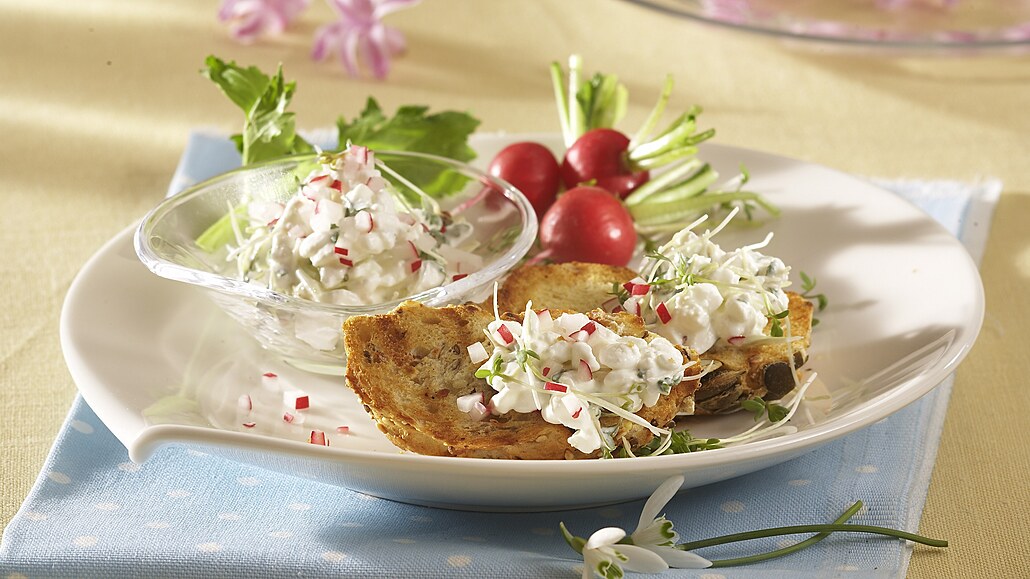 - Řeřichu odřízneme, krátce opláchneme a 3/4 nasekáme nadrobno. Ředkvičky očistíme, omyjeme a nastrouháme nebo nakrájíme najemno. Do misky dáme sýr, podle chuti jej osolíme a zakapeme citronovou šťávou, přidáme ředkvičky, řeřichu a pažitku. Vše dobře promícháme.