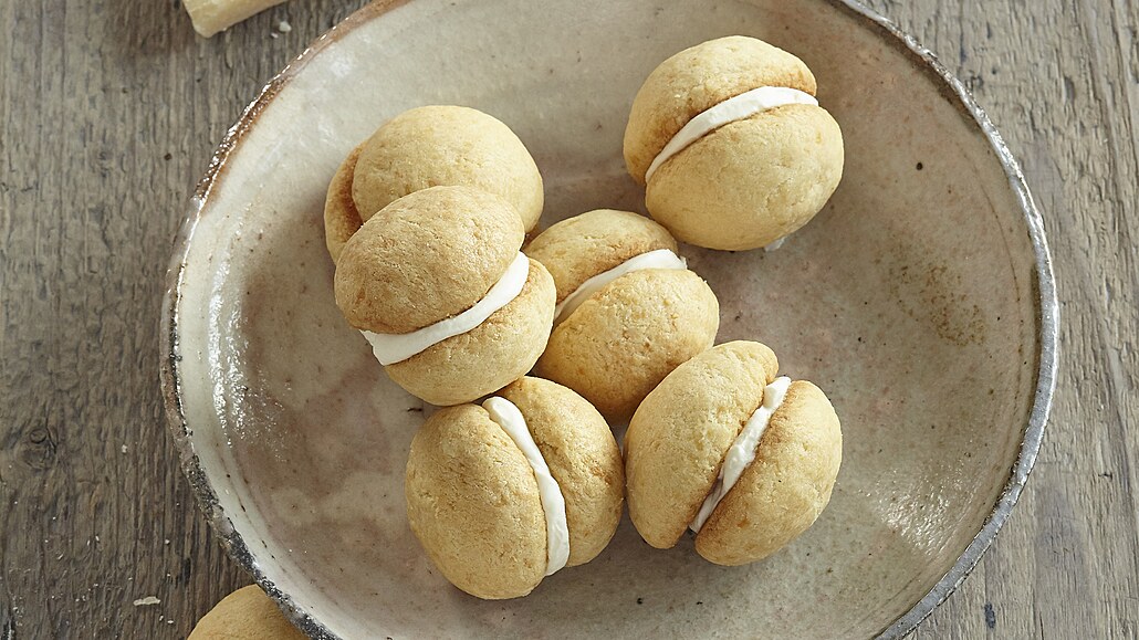 - Mezitím připravíme náplň. Čerstvý sýr dáme do misky, přidáme zakysanou smetanu, lehce okořeníme pepřem a rozšleháme. Vždy dvě sušenky slepíme krémem a přimáčkneme k sobě, aby byl krém po obvodu vidět. Po stranách můžeme obalit v nasekaných oříšcích.