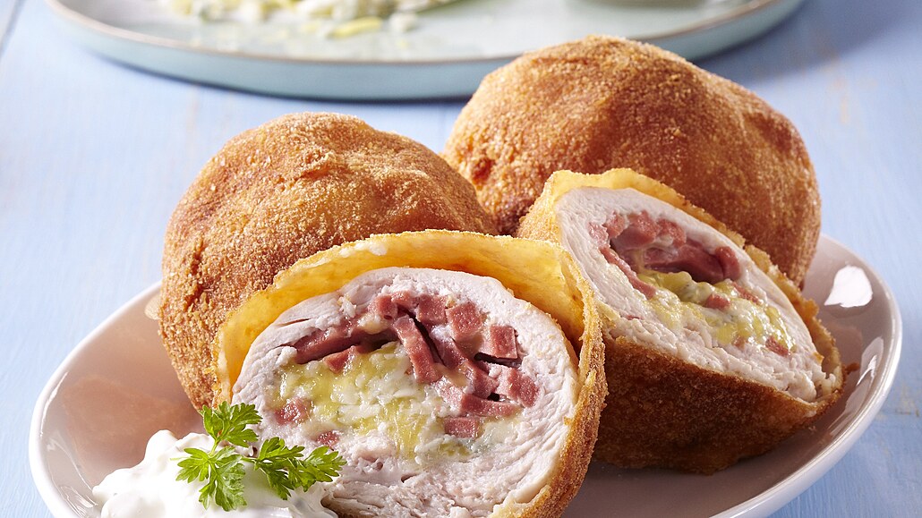 - Šunku nakrájíme na nudličky. Eidam a nivu nastrouháme. Na plátky masa rozdělíme nakrájenou šunku a nastrouhané sýry. Plátky s náplní stočíme do koulí.
