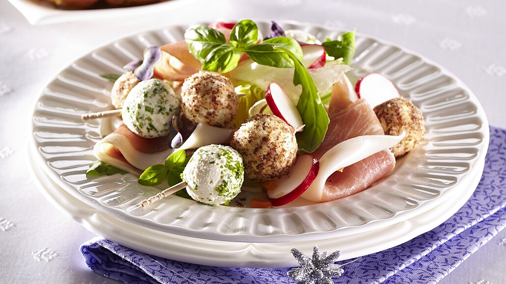 - Ochucený salát rozdělíme na talíře a přidáme plátky parmské šunky. Obložíme sýrovými kuličkami napíchanými na krátké špejle.