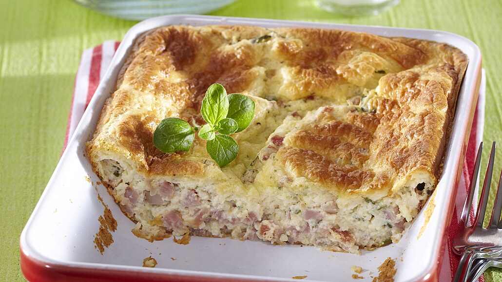 - Vložíme do vyhřáté trouby a zapékáme při 180 °C asi 30 minut. Sýrový nákyp ozdobíme čerstvou bazalkou a ihned podáváme se zeleninovým salátem.