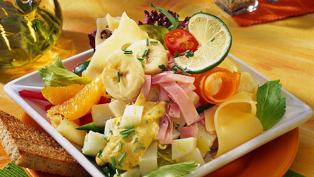 - Přidáme oloupaný a na kolečka nakrájený banán, filátka z pomeranče, očištěnou nakrájenou papriku, překrájená rajčátka a podélně nakrájenou mrkev. Nakonec vmícháme plátky šunky a sýra a salát dáme na chvíli do chladničky.