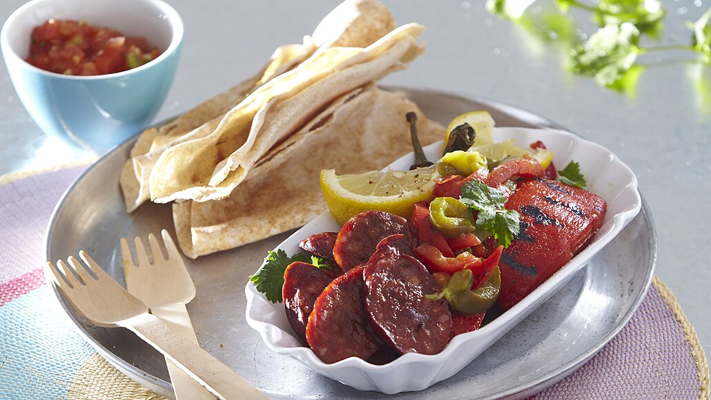 - Tortilly opečeme na pánvi a podáváme jako přílohu k chorizu s paprikou. Vše doplníme plátky citronu a některou z pikantních mexických omáček.