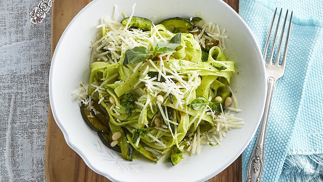 - Do připraveného základu vmícháme těstoviny, máslo a prohřejeme. Poté přidáme pesto a důkladně promícháme. Hotové těstoviny posypeme parmazánem, piniovými oříšky a ozdobíme čerstvou bazalkou.